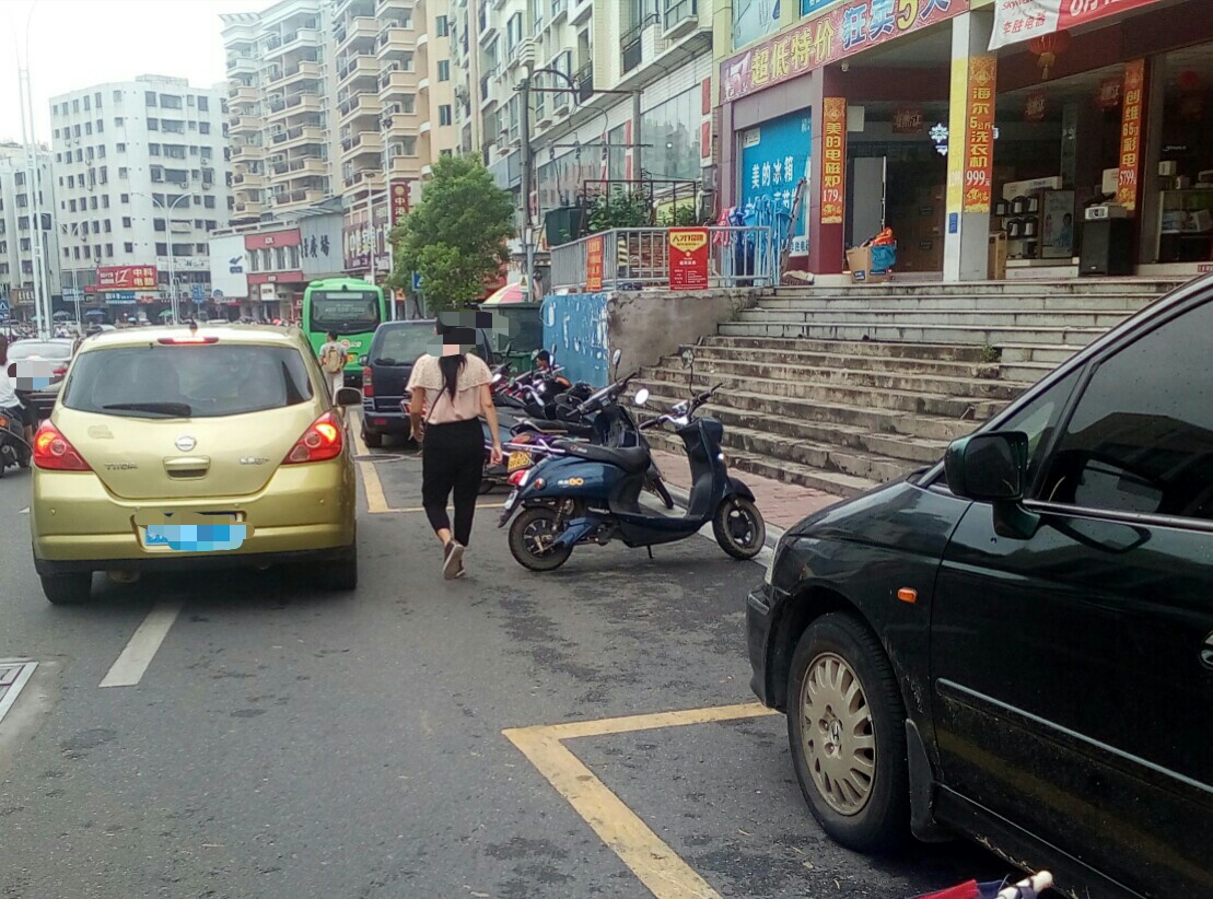 看此图片,管理者已为商家留有出入通道,占用车位完成是商家自私自利的行为。再说整条人民路两旁全都是铺面,在那里划车位以否应该以道路交通安全和通畅为前提吧!