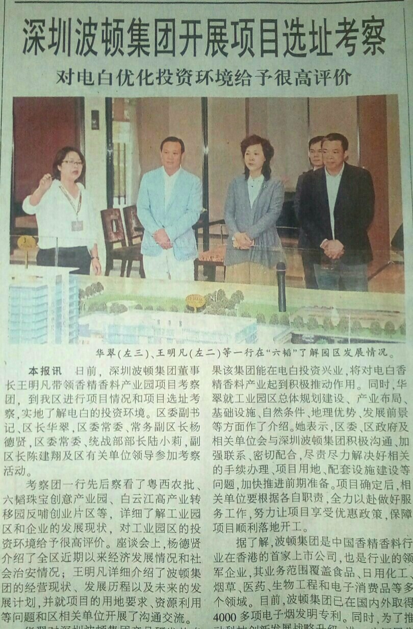 主导产业招商。经过多年发展,该区工业园食品(含水产品)加工、香精香料、家居建材、珠宝加工、医药与健康五大主导产业初具雏形,集聚效应日趋明显。其中香精香料产业发展尤其突出,电白区最近成功引回的波顿香精产业园项目就是一个好典型。该项目由深圳波顿集团投资建设,项目落户到该区工业园,规划面积1000亩,计划总投资33亿元。波顿集团计划把位于深圳市的厂区及部分研发转移过来,建设2个基地、4个研发中心和9个生产中心,并配套相关仓储和辅助设施。该项目定位于打造国际一流的香精香料研发生产中心、国际一流的电子烟生产产业园区、国内第一的电子烟生产基地、波顿集团电子烟产业总部基地。项目分二期建设,项目建成投产后,年产值近200亿元,能提供就业岗位5000多个。