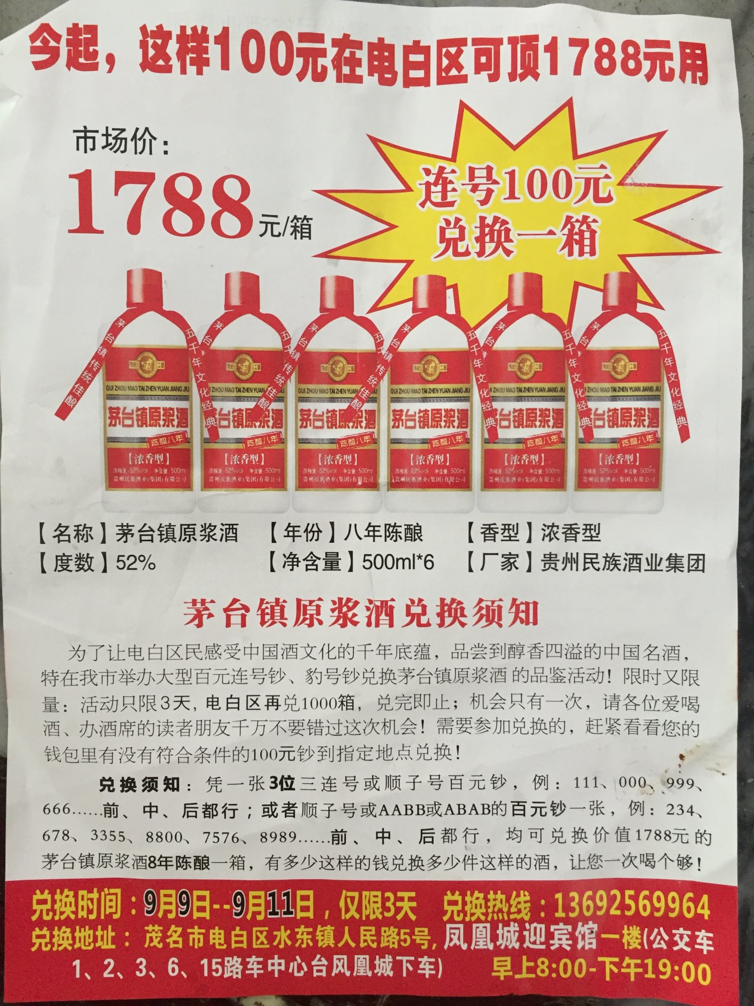 爆料 @电白区工商局尽快查处百元连号换茅台酒骗局!避免更多人上当受骗!