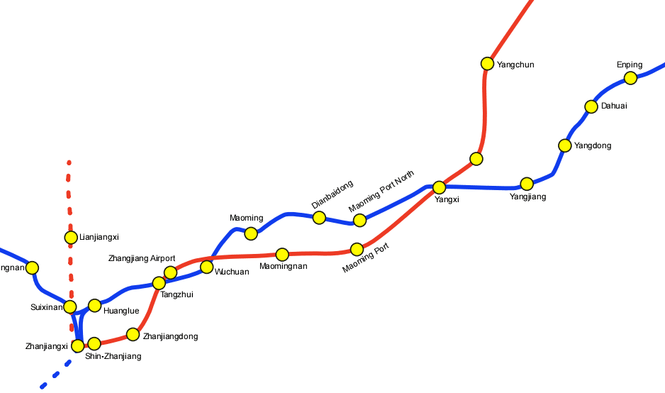 茂名两个站分别茂南南和茂南港,位置估计在市民中心和电城