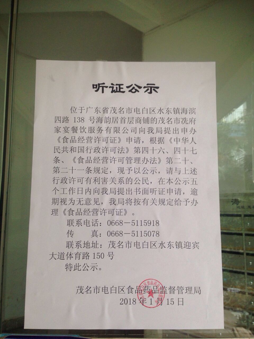 茂名市冼府家宴餐饮服务有限公司向我局申办《食品经营许可证》,依据《中华人民共和国行政许可法》《中华人民共和国食品安全法》《食品经营许可管理办法》等法规规定,我局依规举行了听证会。我局现正依法、依程序办理上述行政许可事项。衷心感谢您对我区食品安全工作的关心、监督和支持。发现食品安全问题,欢迎拨打电话:0668—5113838举报投诉。