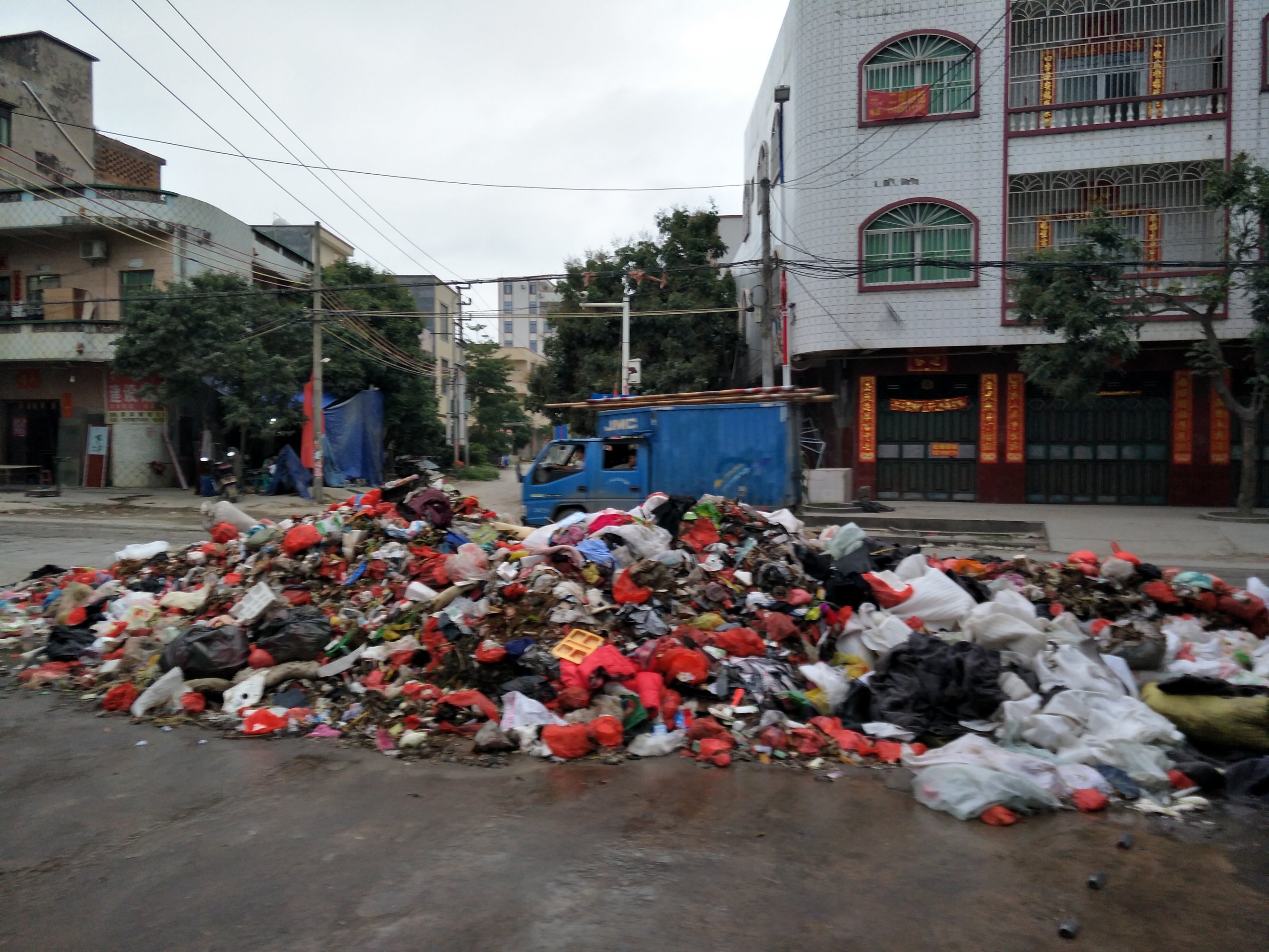 垃圾堆满街,熏得头晕,此圩不能住了,连最好的街口,羊角至黄岭的交通要道都这个样子,还有什么前途!不如卖屋好了!