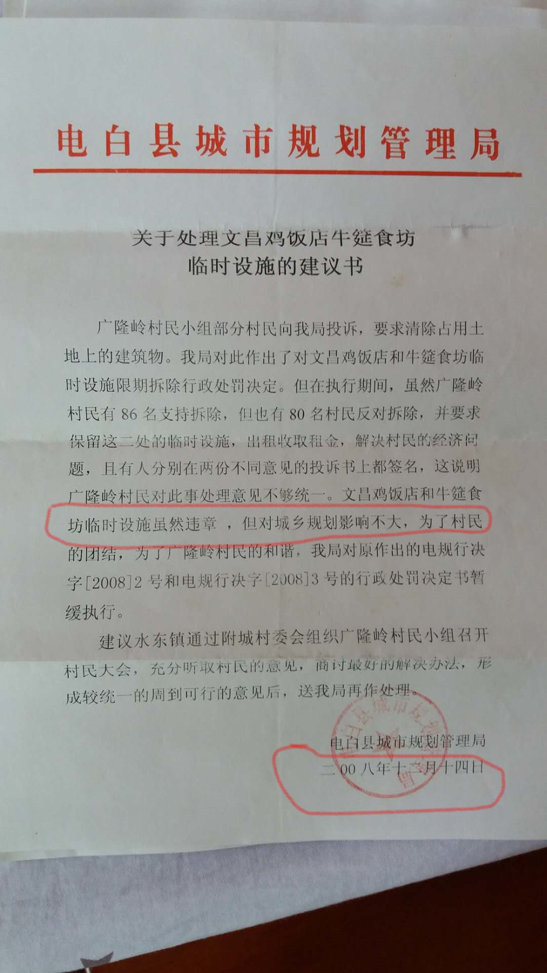 看来有必要把合同红线图发上来给大家看看以及2008年村民上访后县政府抓村民回来,说帮村民解决问题的回复资料。这份是2008年电白还是县的时候规划局的发文。当初村霸伪造村民签名,说承租村民的土地,但这10年来,村民一分钱都没收到过。