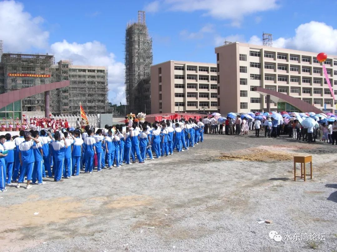 2006年8月30日,天气晴朗,蓝天白云,电白一中搬迁到新校区。整个校区只有那六幢教学楼可以用,只有一条环校道是硬底化。接下来的两、三年,一中的师生经历了什么呢?生活上的不便利、教学设备的欠缺,校园建设严重滞后,停电停水常有、碰上下雨天,经常是脚踏黄泥水到教室,全体师生为校园植树种草是常见的事,体育课、电脑课、学生活动怎么办?可以想象一下当时的景象。还有晚上回校看晚自习,下班的路上,一个人根本不敢走夜路……但那时那些困难全体师生都克服了,他们也成为新校区的开荒牛。
