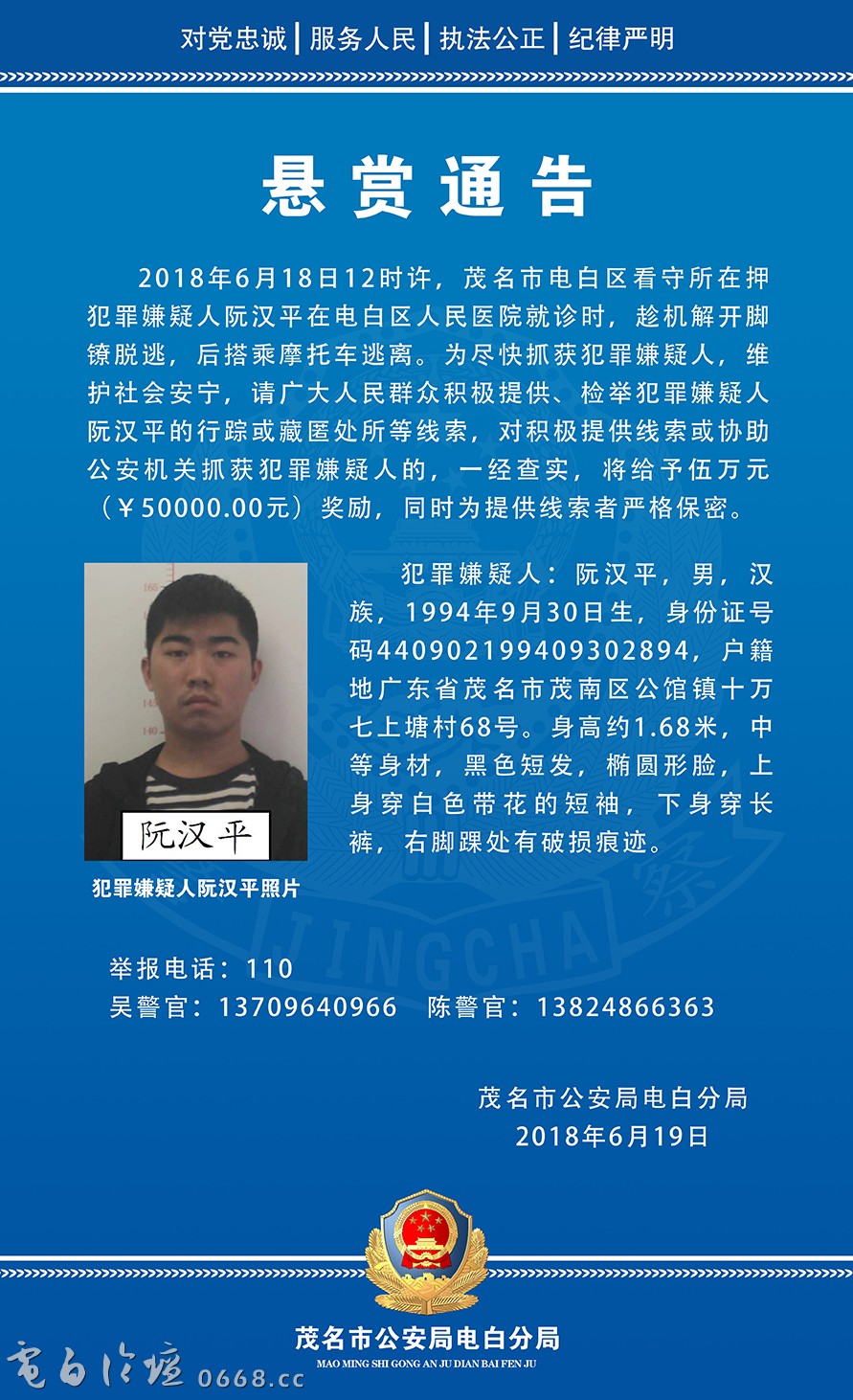 2018年6月18日12时许,茂名市电白区看守所在押犯罪嫌疑人阮汉平在电白区人民医院就诊时,趁机解开脚镣脱逃,后搭乘摩托车逃离。为尽快抓获犯罪嫌疑人,维护社会安宁,请广大人民群众积极提供、检举犯罪嫌疑人阮汉平的行踪或藏匿处所等线索,对积极提供线索或协助公安机关抓获犯罪嫌疑人的,一经查实,将给予伍万元(¥50000.00元)奖励,同时为提供线索者严格保密。(转自:平安电白微博)