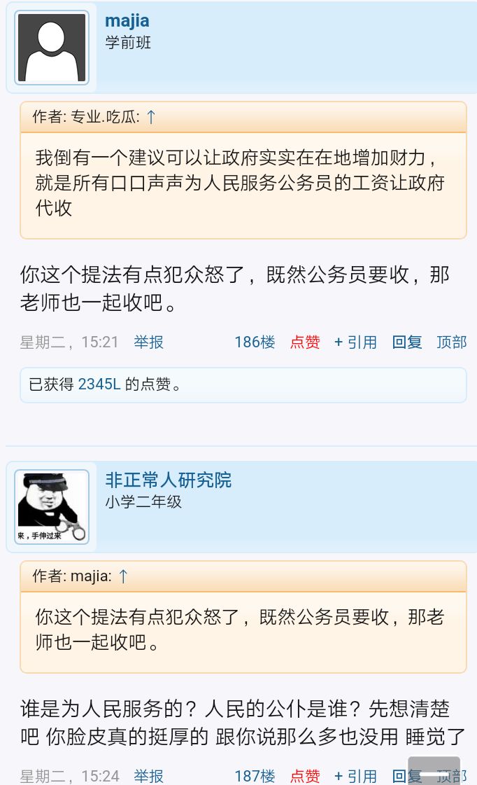 第一次回复他调侃中国是电白的,第二次他说电白的老师比较客气,只会在论坛发牢骚,后来他说到有偿补课,然后majia因为他说了句吃饱了撑的就跟他怼起来,我想说的第一他是不是老师不知道,第二你自己说了自己是公务员,还是高信化的,还跟人家骂了一天,还只是抓着人家莫须有的眼红你补贴骂,你真是给公务员长脸了,还好我不是高信化的,就这样吧,到此为止