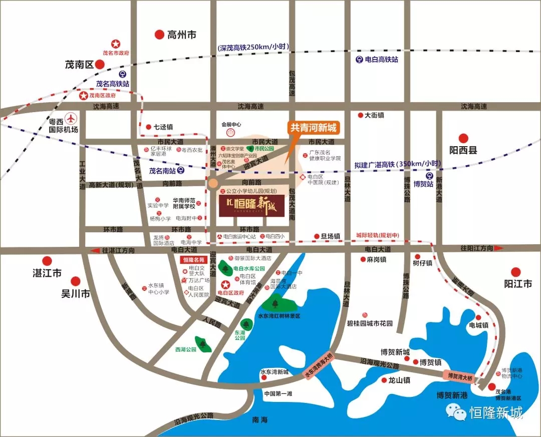 恒隆新城位踞迎宾大道,共青河新城和水东湾新城的交汇点,进可快速到达共青河新城,市民大道片区,退可深入水东湾腹地;茂名2026年省运的主场馆,奥体中心(规划)将落居共青河新城;水东湾新城被列入广东八大湾区。两城交汇,尽享无限繁华!
