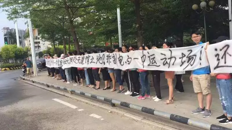 电白一中全体老师,汇集在区政府门口,拉起了横幅: