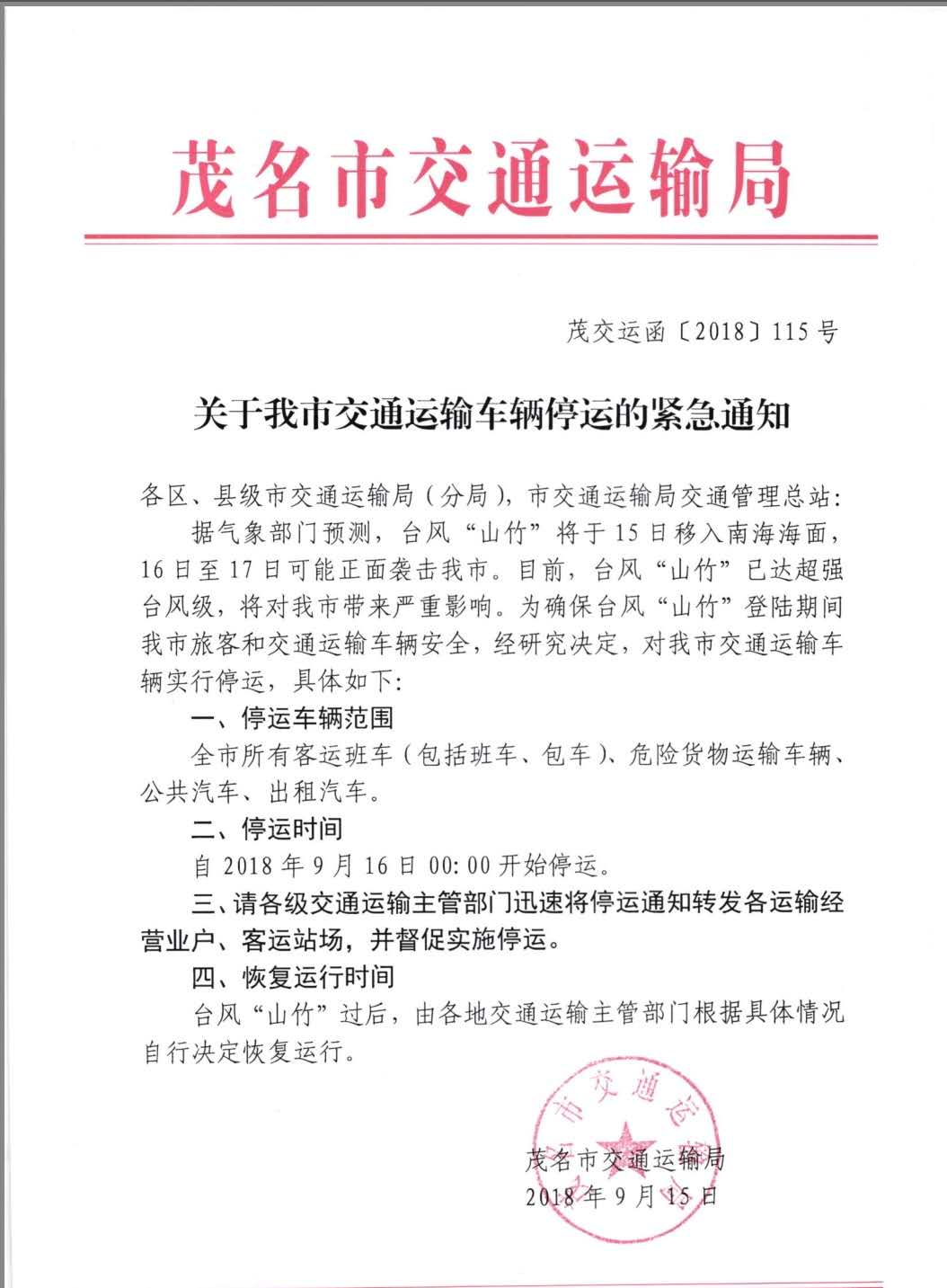 茂 茂名市电白区粤运汽车运输有限公司 幼儿园 注册 2018-09-15 消息 1 反馈评分 1 点数 0 年龄 31 性别 男 2018-09-15 #1 尊敬各位市民、乘客 为确保台风“竹山”登陆期间旅客和车辆的安全,接上级主管部门的紧急通知,我司车辆将于2018年9月16日00:00起开始停运。 茂名市电白区粤运汽车运输有限公司 2018年9月15日 附件 1111.jpg 89.4 KB · 查看: 620