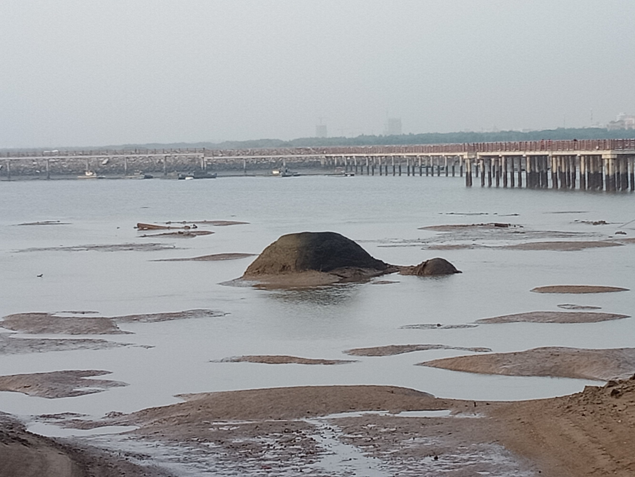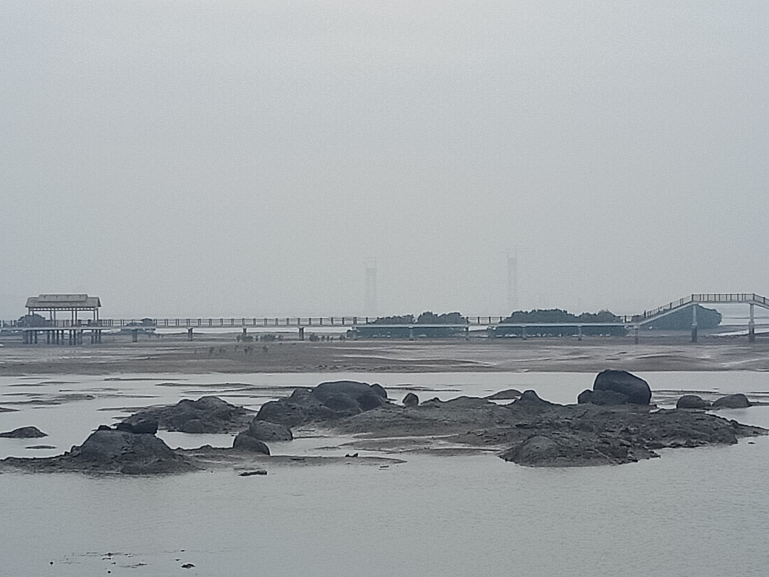 但退潮或也许有翻景像,见有一群白露白鸳等鸟在湿地上飞翔觅食追逐,特那观鸳阁位置、还有湿地上的蟹,还有沉积在栈道旁未完全退去海水~等等~