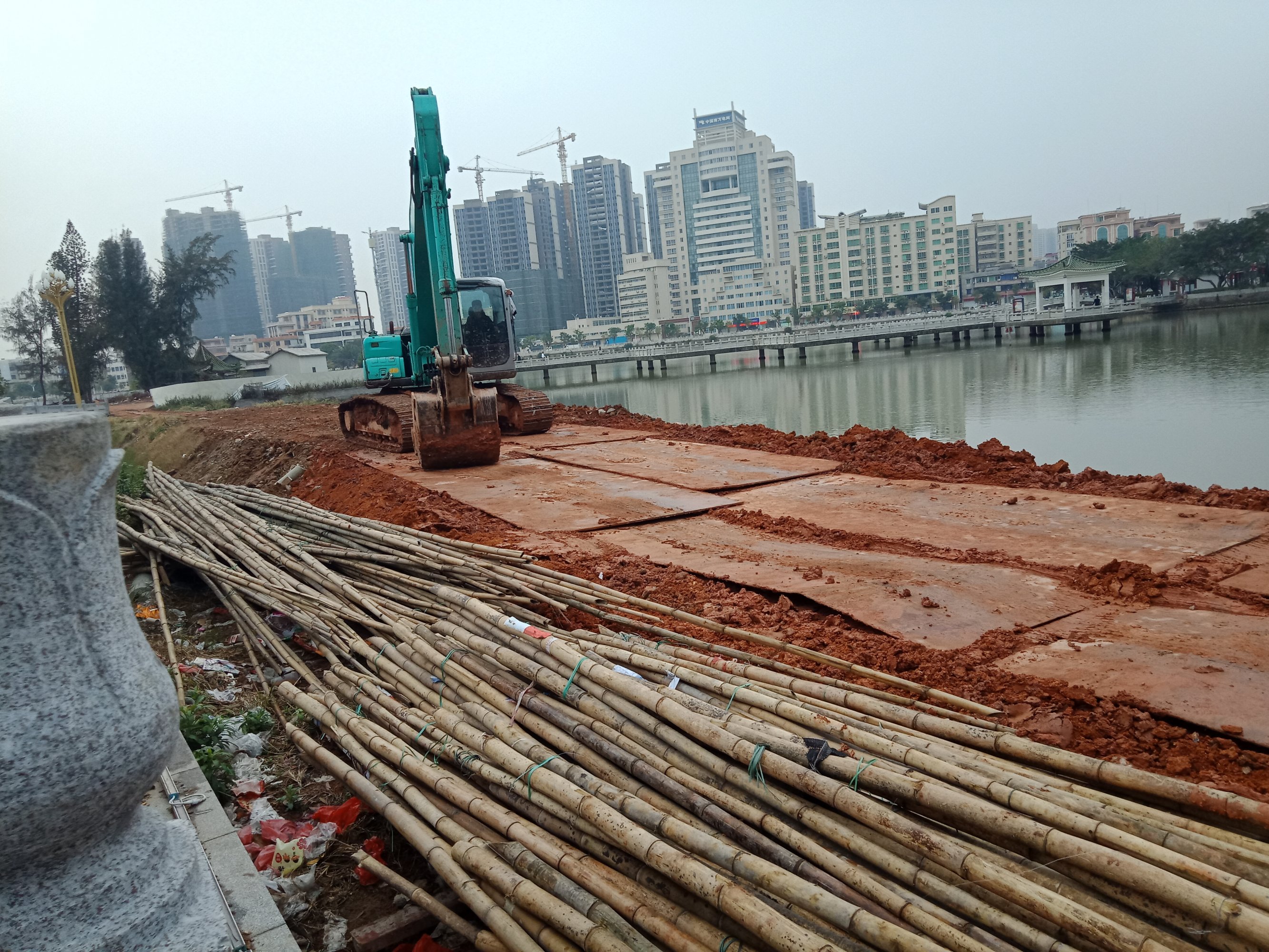 西湖公园内的原三馆地址,不停有车拉泥进来填湖,推土机机声隆隆,热火朝天。