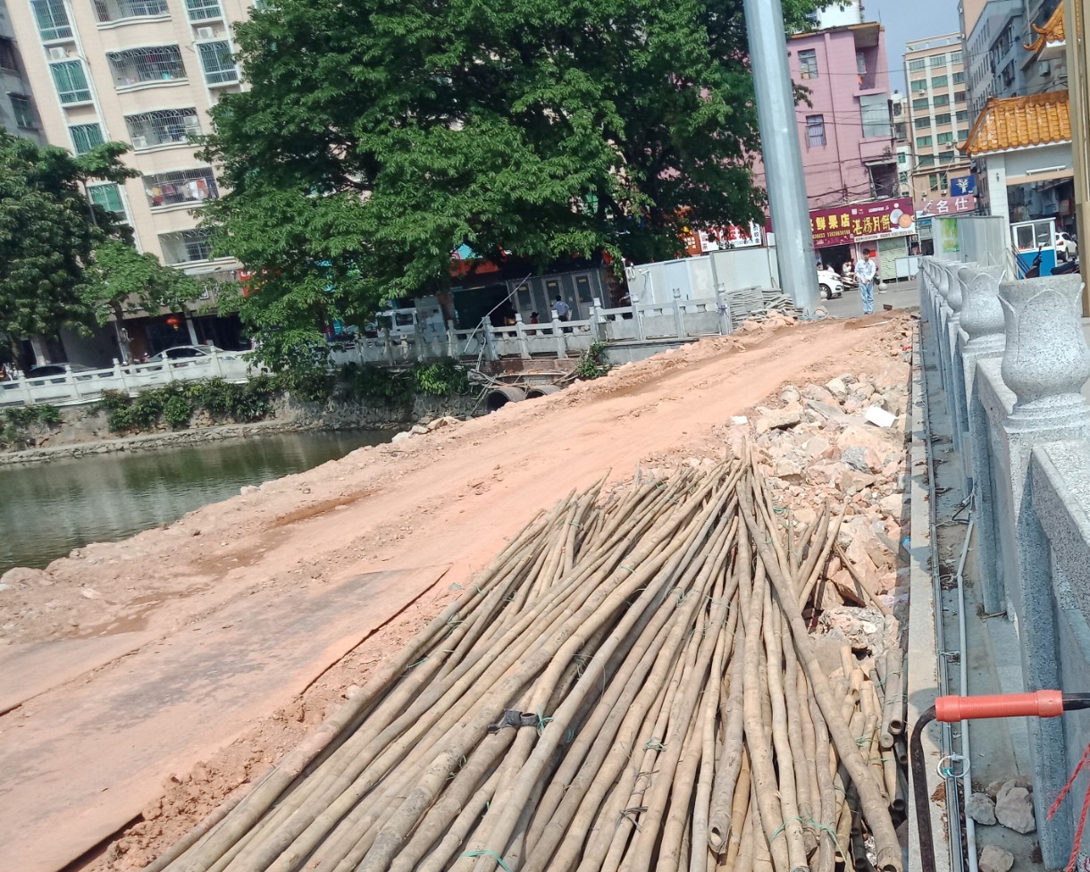 貌似节前已铺好拱桥旁的便道~而节后就貌似见有工程车运泥入内~而春后落些雨~而造成工程车卡轮~而后又貌见在路基上铺钢板(注地基用大石铺㡳,貌似几坚固~