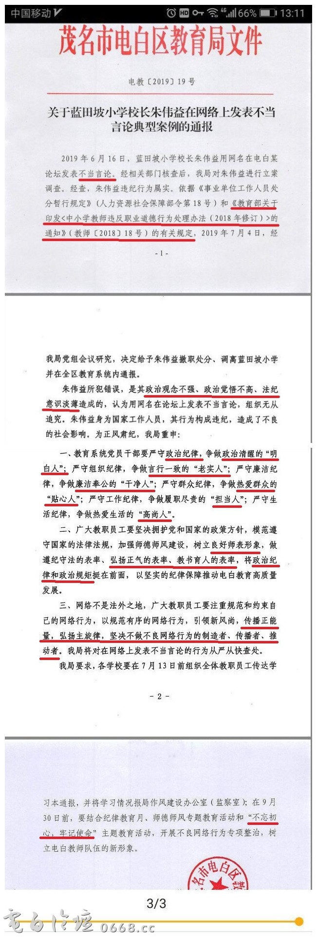 电白教育怪事多,无可救药了!高中招生春华分数线比一中高出40分,民校压倒公校,一中的脸往哪儿搁,政府的面往哪儿搁?天大的笑话!蓝田坡小学朱校长作为一名有良知的知识分子,在电白区创卫期间,关心师生健康问题,发了个垃圾焚烧臭,方圆十里都能闻到的帖子,这是对当地政府创卫工作不足的真实反映,当地政府应该感谢朱校长才对,但政府第一时间不是解决问题而是解决指出问题的人。说真话的校长不但给撤职,还语焉不详地扣了各顶大帽子作为典型通报批评,这是对读书人极大的侮辱。