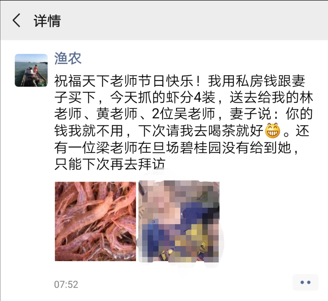 小池,一位开朗健谈,心地善良,勤奋励志的渔民,电白区寨头村人。去年起,把日常出海打渔的点点滴滴,拍了视频发到网上,在腾讯,网易,火山,今日头条等等视频网站上点击率爆棚,账号:渔农小池。在外国著名网站Youtube上面,更是每个视频都有十万以上人观看。逐渐有点小名气的小池现在依旧没有飘,来自全国各地,包括港台的同胞偶尔来找他,小池很热情地带他们去吃饭,不遗余力地向他们介绍电白这座海滨小城。小池文化并不高,在今天教师节这个特别的日子里,他做了一件很普通的事情来感谢致敬教过他的老师。 Screenshot_20190910_143439.jpg Screenshot_20190910_143534.jpg mmexport1568097370005.jpg mmexport1568097374482.jpg