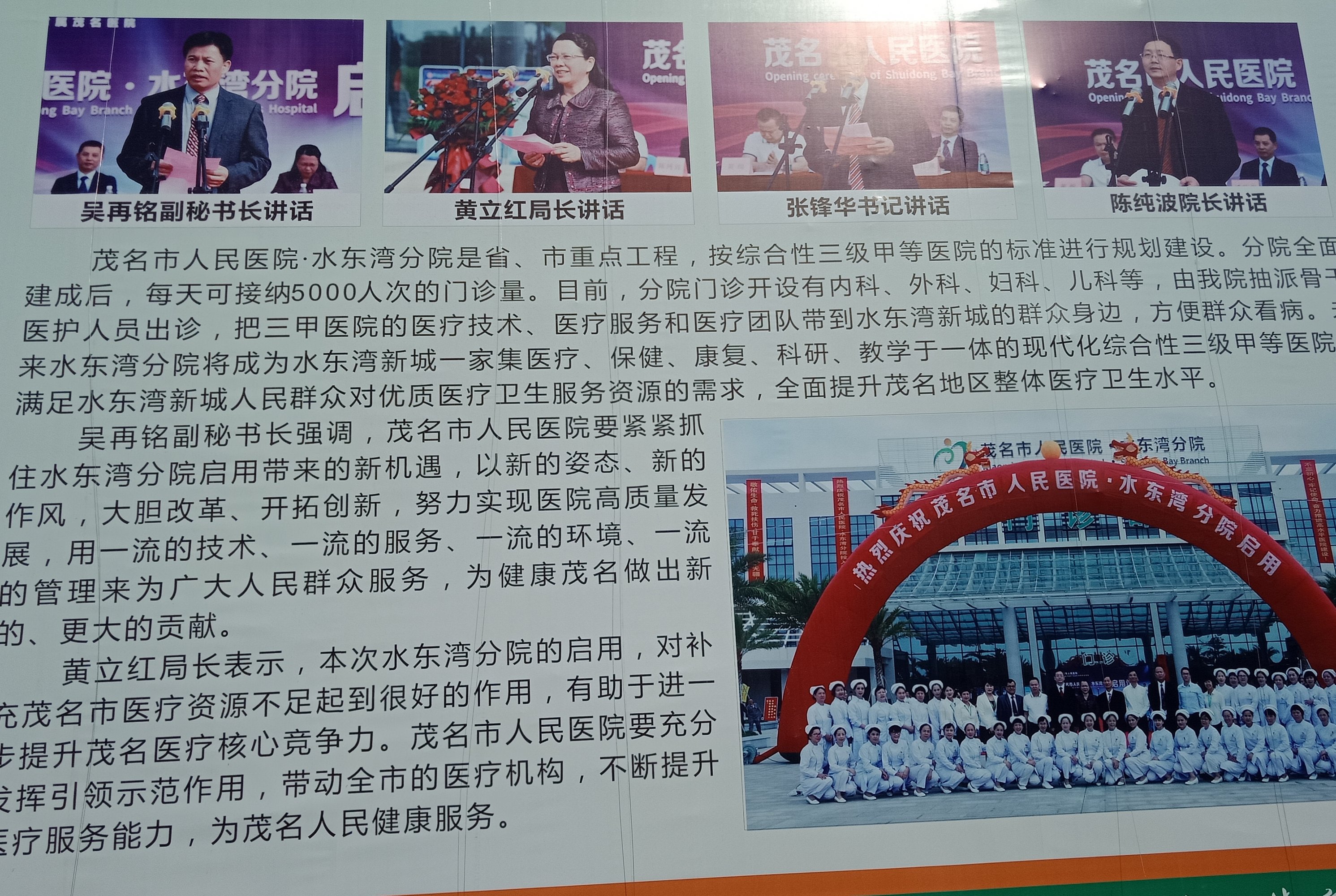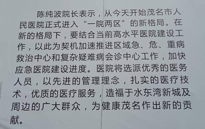 我系良民 说: 开业了。11月12日,茂名市人民医院水东湾分院正式启用,目前已开设内科、外科、妇科、儿科等多个科室门诊,方便周边群众就医。 点击展开... 不是叫茂名市中心医院吗,当时说是独立的三甲医院,现在怎么成了水东分院了