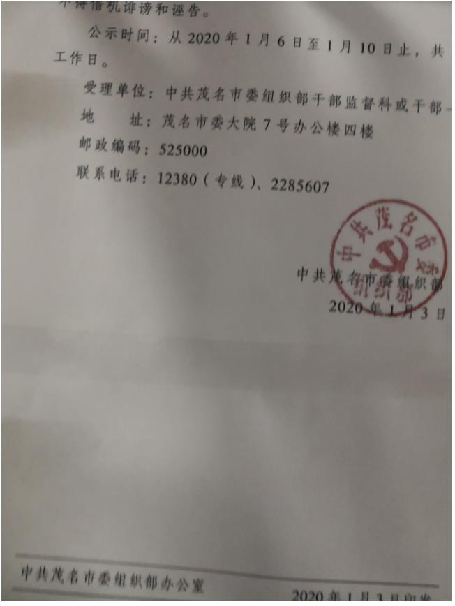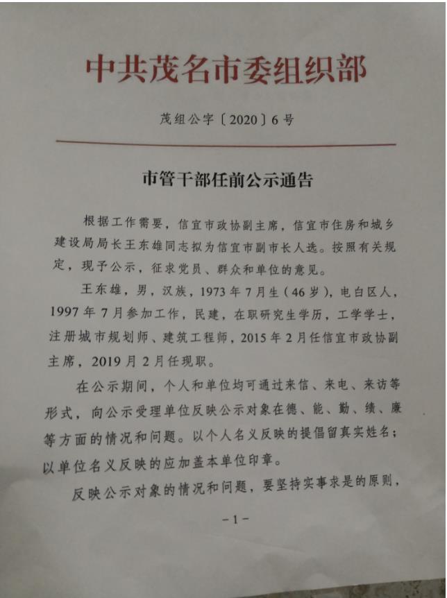 茂组公字【2020】6号公示信宜市政协副主席兼信宜市住房和城乡建设局局长王东雄拟任信宜市副市长,公示时间至2020年1月10日止。