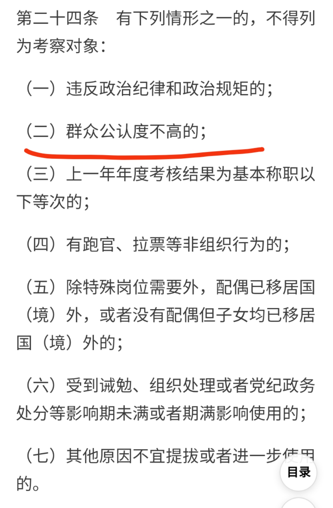 你误会了,本人文中清楚地表述,是说王领导现阶段(不是说以前也不是说以后,因为评议结果公布至今才12个月多一点)“群众公认度”低,正是选拔条例明确规定不能作为选拔考察对象的第二种情形。