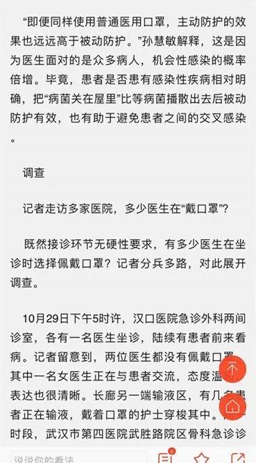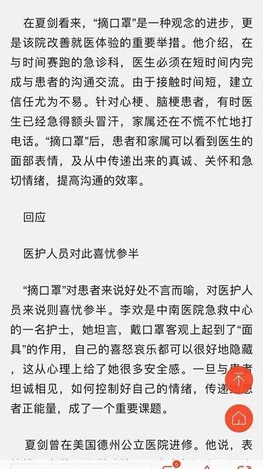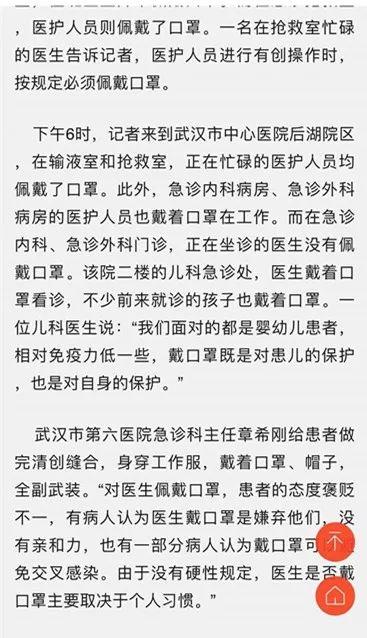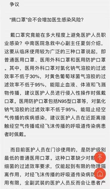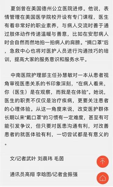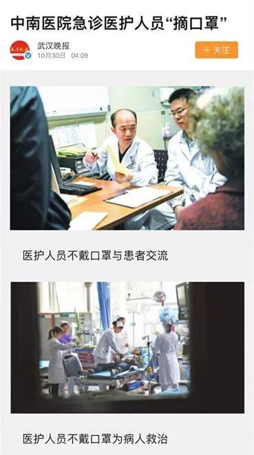 上面就是武汉晚报的报道,2019年10月30日,武汉晚报报道,标题上原文说:武汉中南医院急诊医护人员摘口罩,靠它防病作用有限,医患交流反增隔阂,院方坦诚相见,便于拉近医患关系,并非一刀切!