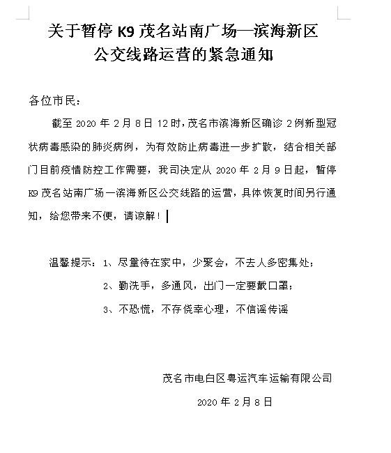截至2020年2月8日12时,茂名市滨海新区确诊2例新型冠状病毒感染的肺炎病例,为有效防止病毒进一步扩散,结合相关部门目前疫情防控工作需要,我司决定从2020年2月9日起,暂停K9茂名站南广场—滨海新区公交线路的运营,具体恢复时间另行通知,给您带来不便,请谅解!