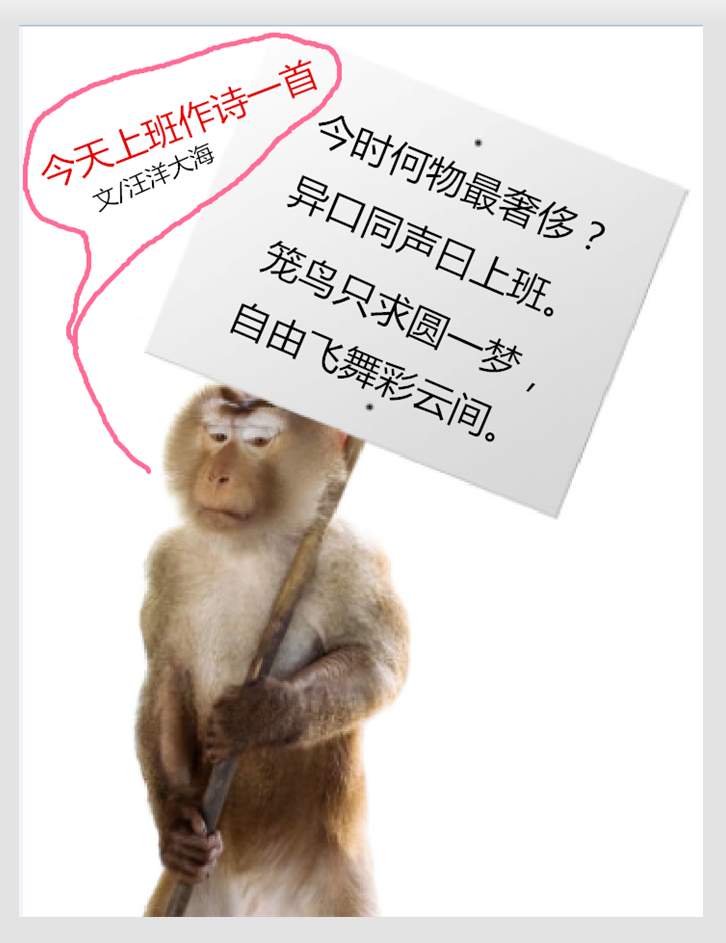 七绝·无题 文/汪洋大海 今时何物最奢侈? 异口同声曰上班。 笼鸟只求圆一梦, 自由飞舞彩云间。