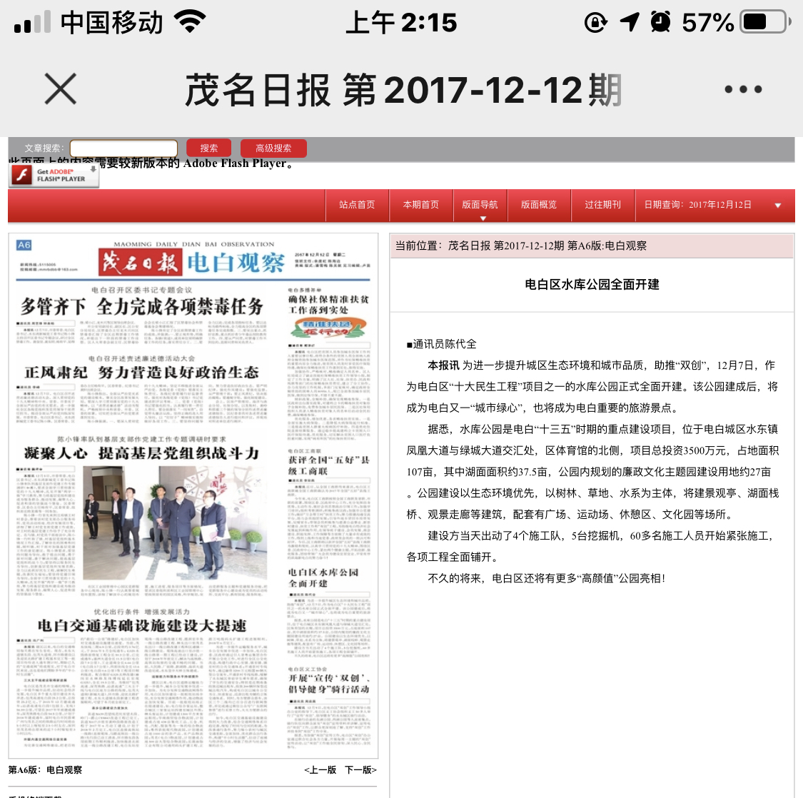 本报讯 为进一步提升城区生态环境和城市品质,助推“双创”,12月7日,作为电白区“十大民生工程”项目之一的水库公园正式全面开建。该公园建成后,将成为电白又一“城市绿心”,也将成为电白重要的旅游景点。