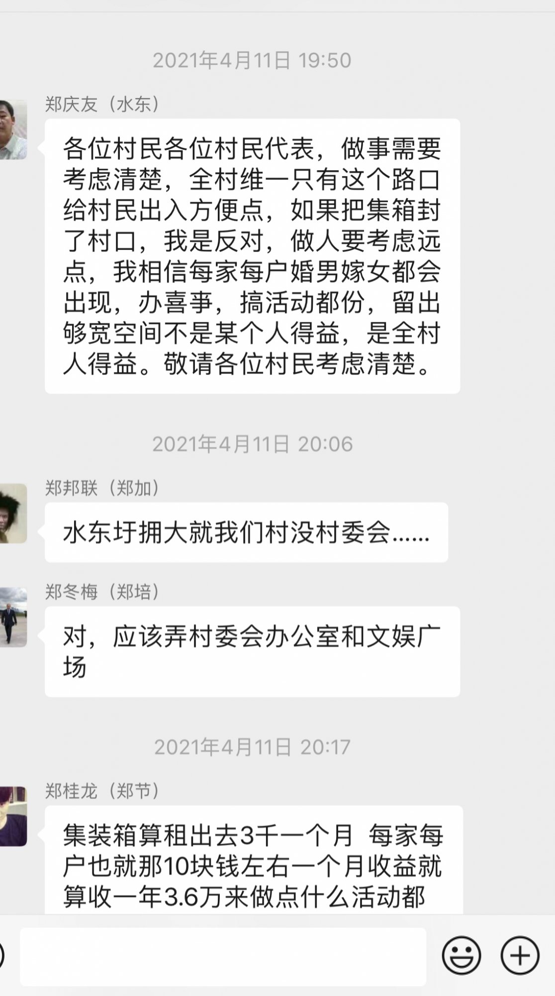 这段时间收到多名村民的私信,多数是反映村口空地处置问题。主要有不满村口停车乱象影响村民出行问题,也有不乐意见空地被边上几户人占为己用,建议要么好好利用起来做公益,要么盖回村厕所。也有人多次说到郑庆友私心重。