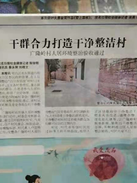 全区农村人居环境整治巩固提升村村过关“百日攻坚战”,广隆岭村积极参与配合政府有关单位工作,加力加劲、真抓实干、本村已验收通过了区农村人居环境提升村村过关目标任务,并登上了茂名日报新闻报纸。(图片资料来自村群和村民发布)