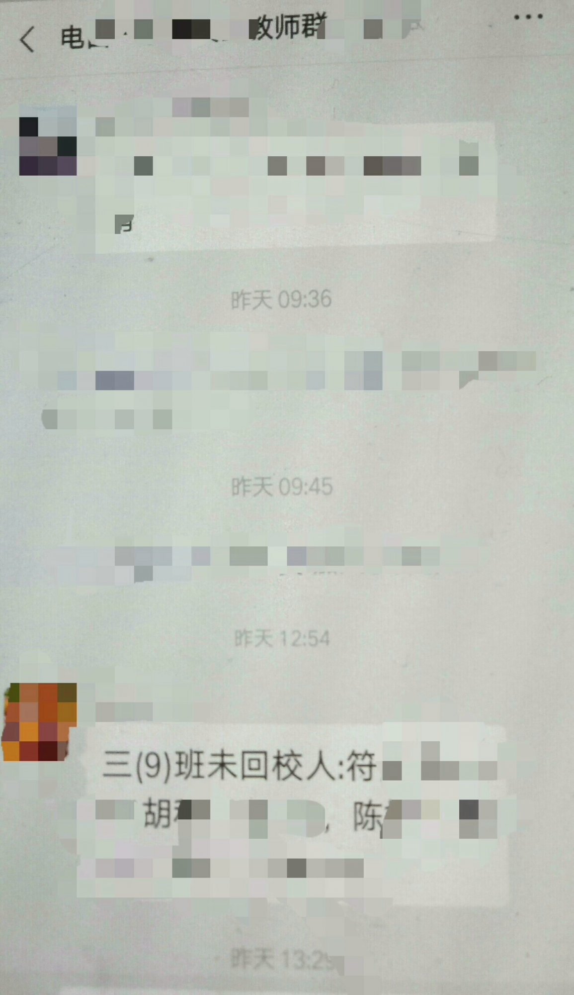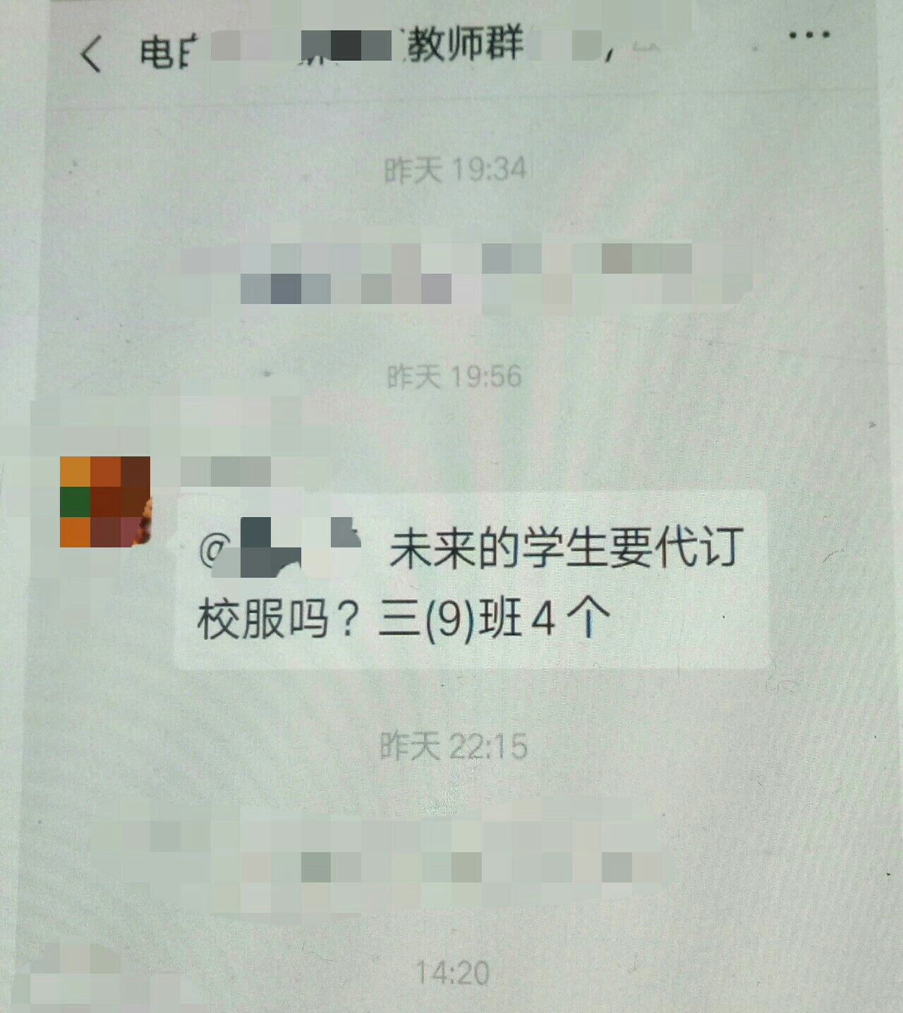 从时间等方面分析: 1.图片一句话是中午,另一句是晚上,不连在一起。 2. 三(9)班,应该是三年级。 3.图片上面很清楚看到,“电*…教师群”,应该是教师。 4.向学校汇报代订校服情况,应该是班主任。 5.语文老师很多是班主任。 小结: 这位老师应该是,电*某学校三(9)班语文老师兼班主任。