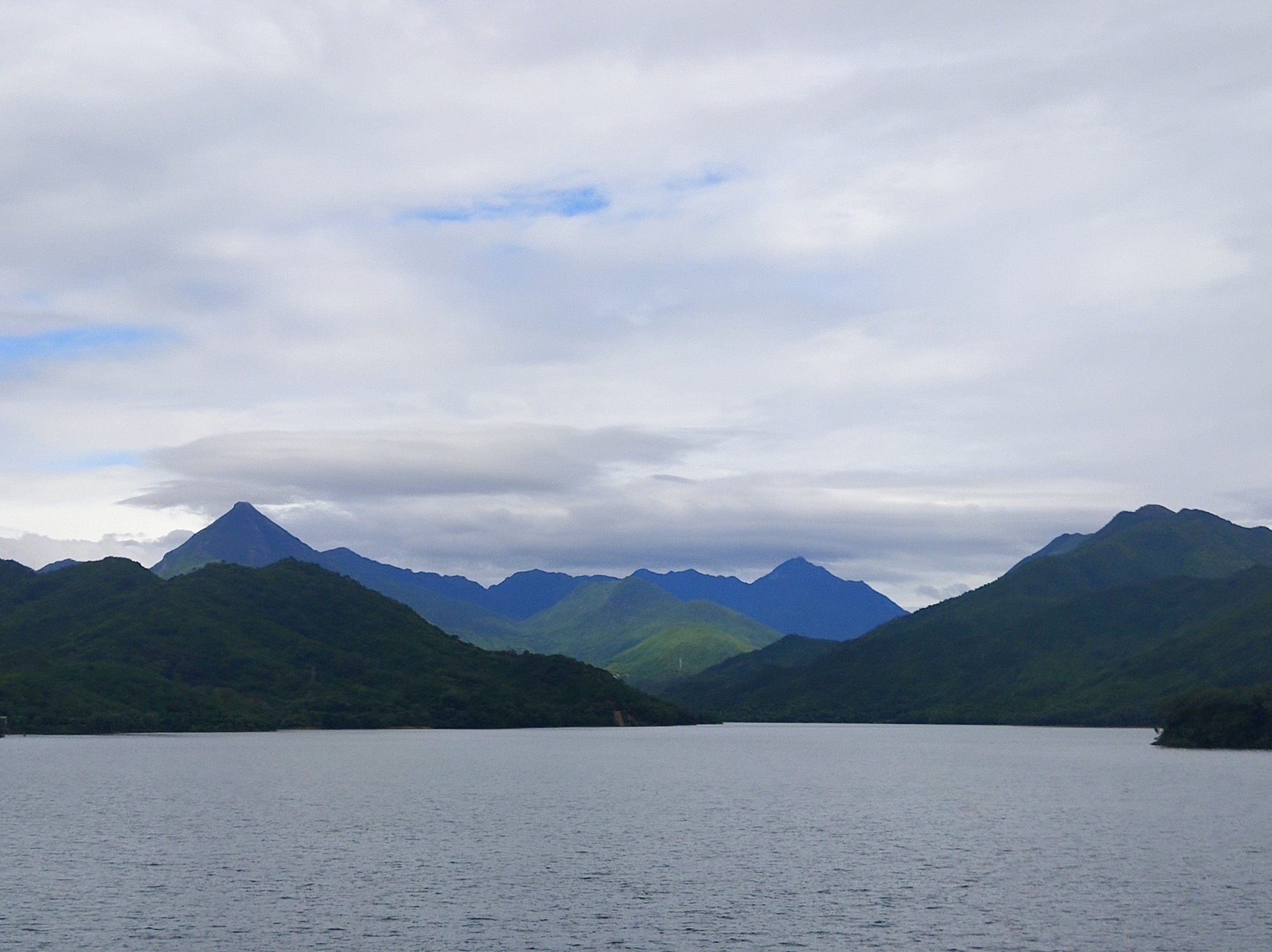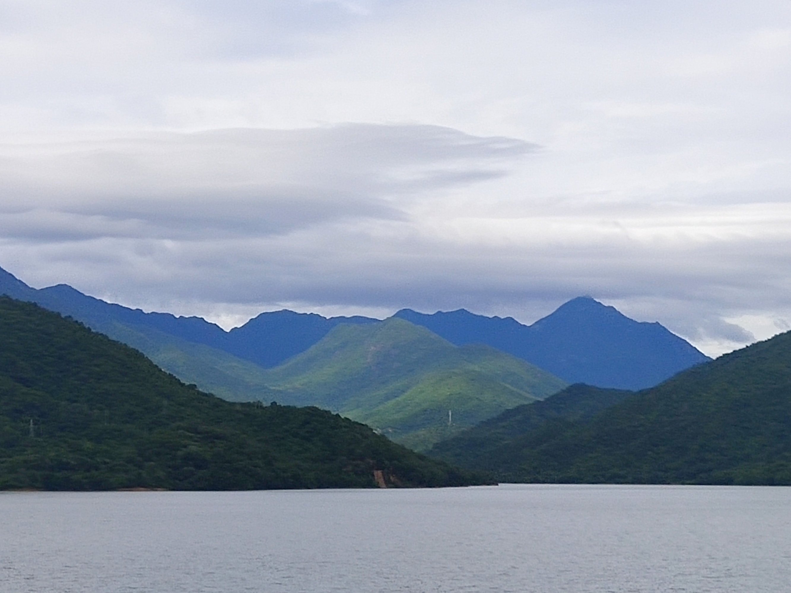 中间山太阳照射,前后云层遮挡阳光,视觉上前灰后蓝!正常,不是大神修练