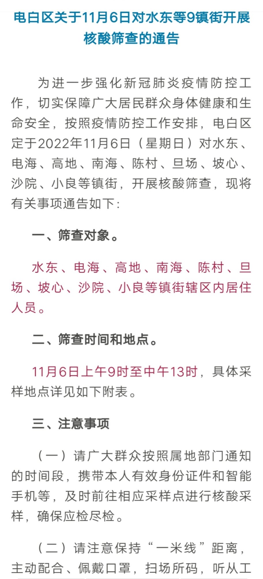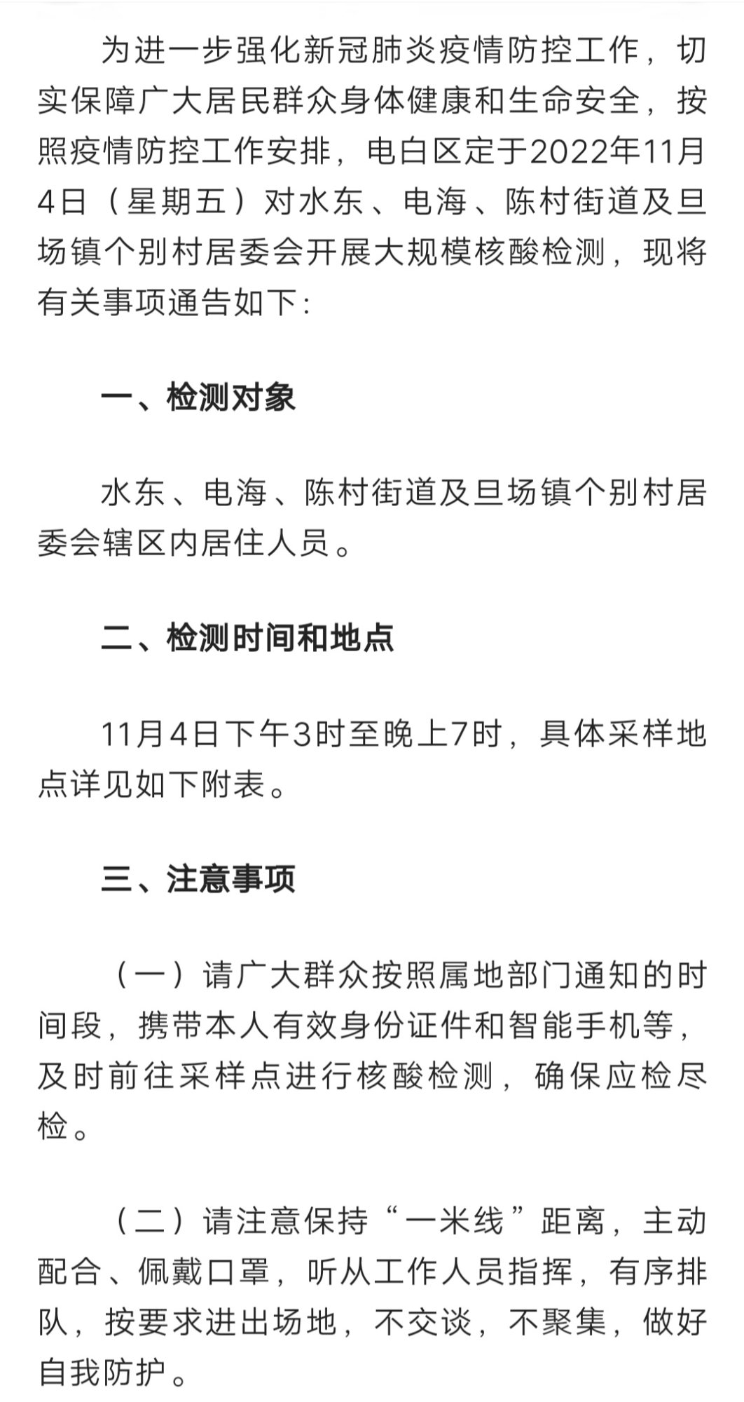 转帖 关于11月4日对电白区水东电海陈村街道,旦场镇个别村居委会开展大规模核酸检测的通告