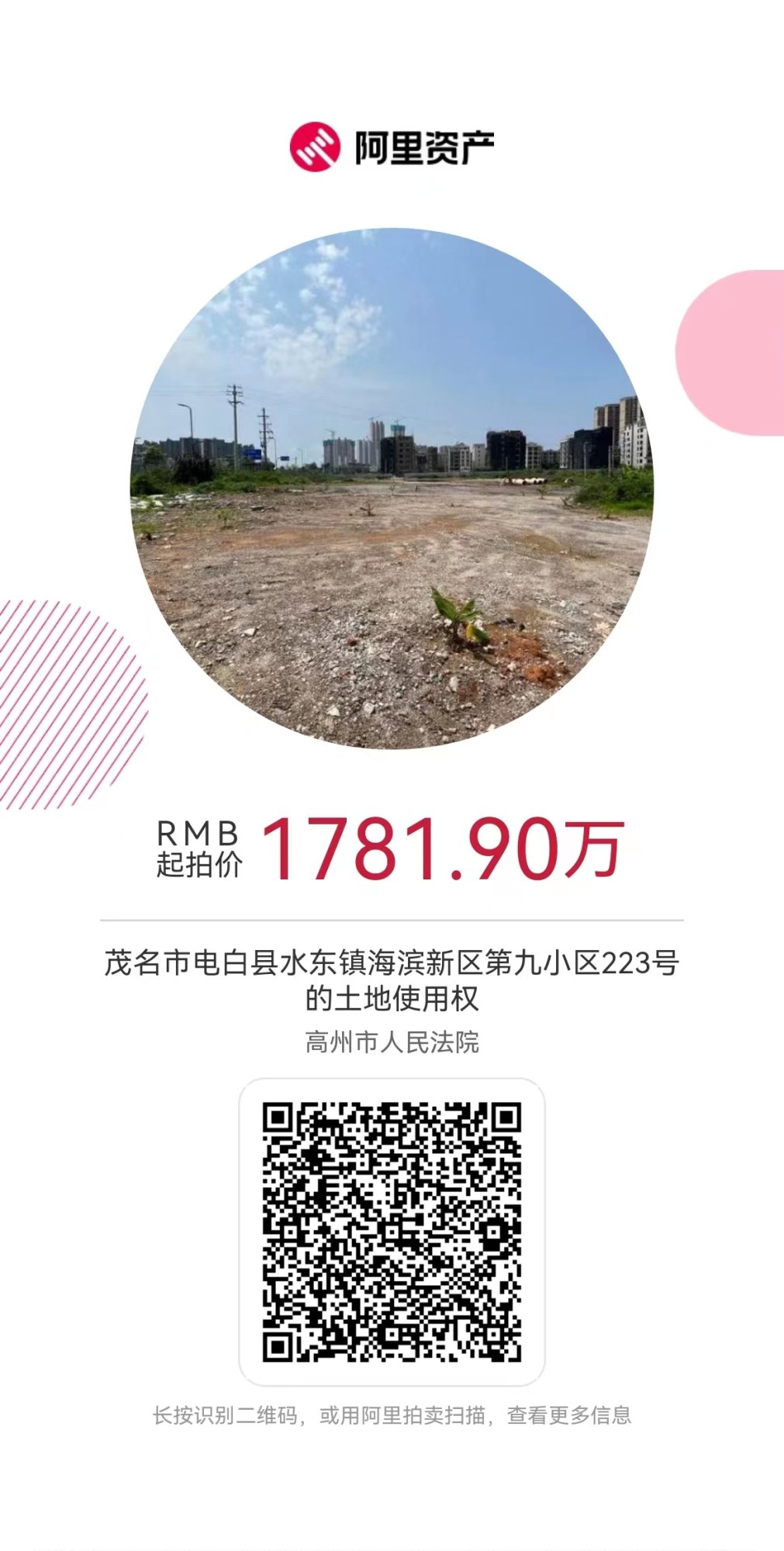 茂名市电白县水东镇海滨新区第九小区223号的土地使用权8月10日淘宝网司法拍卖有兴趣的朋友识二维码了解