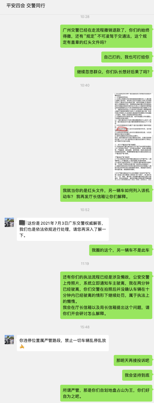 11月23日,四会交警来电,还是坚持不符合免罚规定,说省厅在2021年发布一份规定,在省内有违章的不能享有轻微违章免罚条件,并让我去他们中队看相关文件,我说我不想去,你发给我看,四会交警大队随后添加微信并发送了一个doc文档,我核查了下,文档内容在网上有:http://gdga.gd.gov.cn/bsfw/bmts/content/post_3337476.html 但我仔细一看,并挑出问题,省厅的规定“(二)该机动车和驾驶人在本次违法的前半年内,在本省没有交通违法记录的” ,我的另一部车的违章不应关联到这部车的首次违法,很明显四会交警的解答违背省厅规定精神。