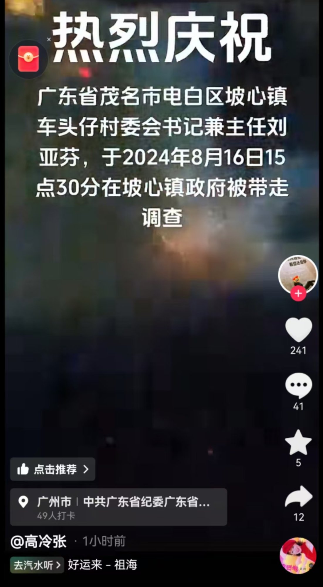 在抖音看到村民自发性的去村委会放炮放烟花,听说坡心高在职的时候他可是横着走的。坡心所有工程都是刘亚芬做完。小虾米大力量啊。