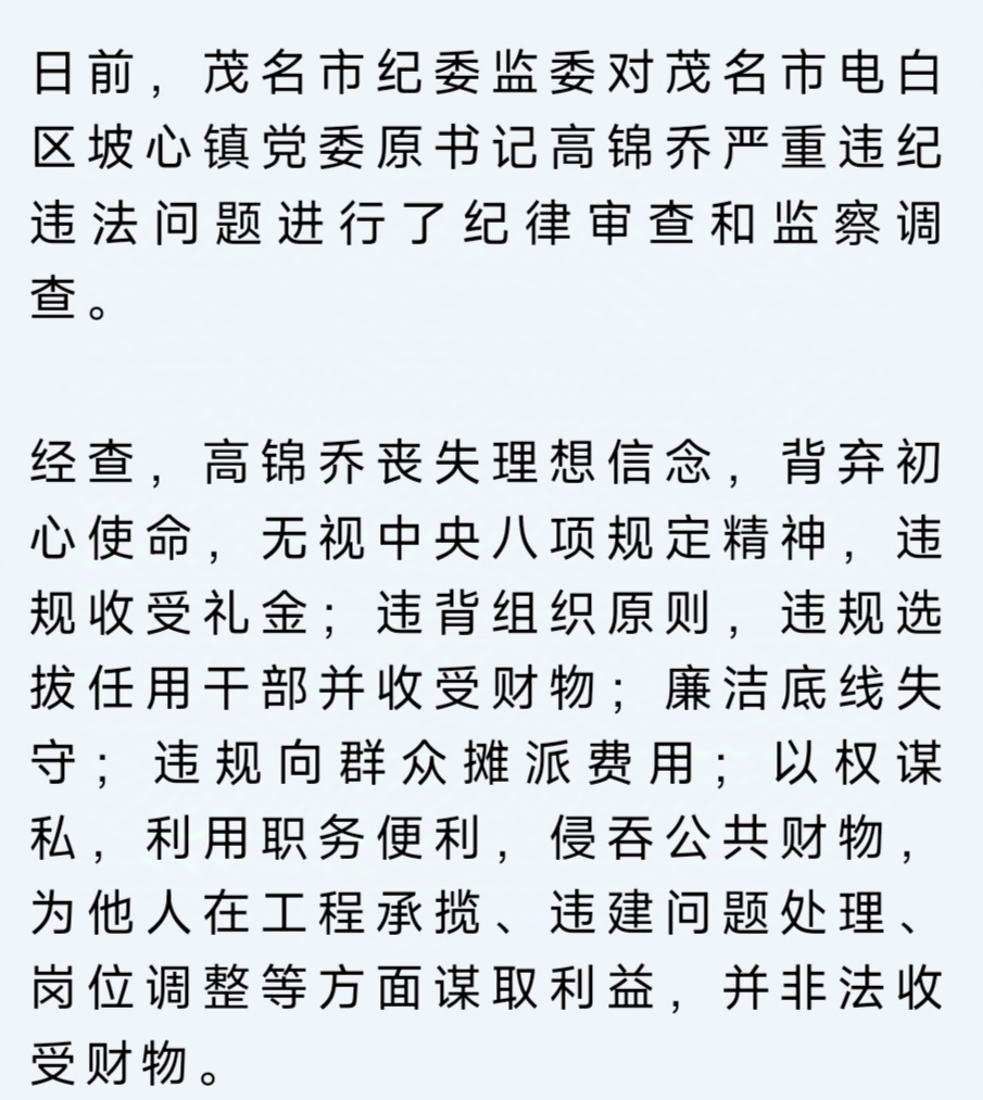 茂名市电白区坡心镇车头仔村党总支部书记、村委会主任刘亚芬涉嫌严重违纪违法,目前正接受茂名市电白区纪委监委纪律审查和监察调查。