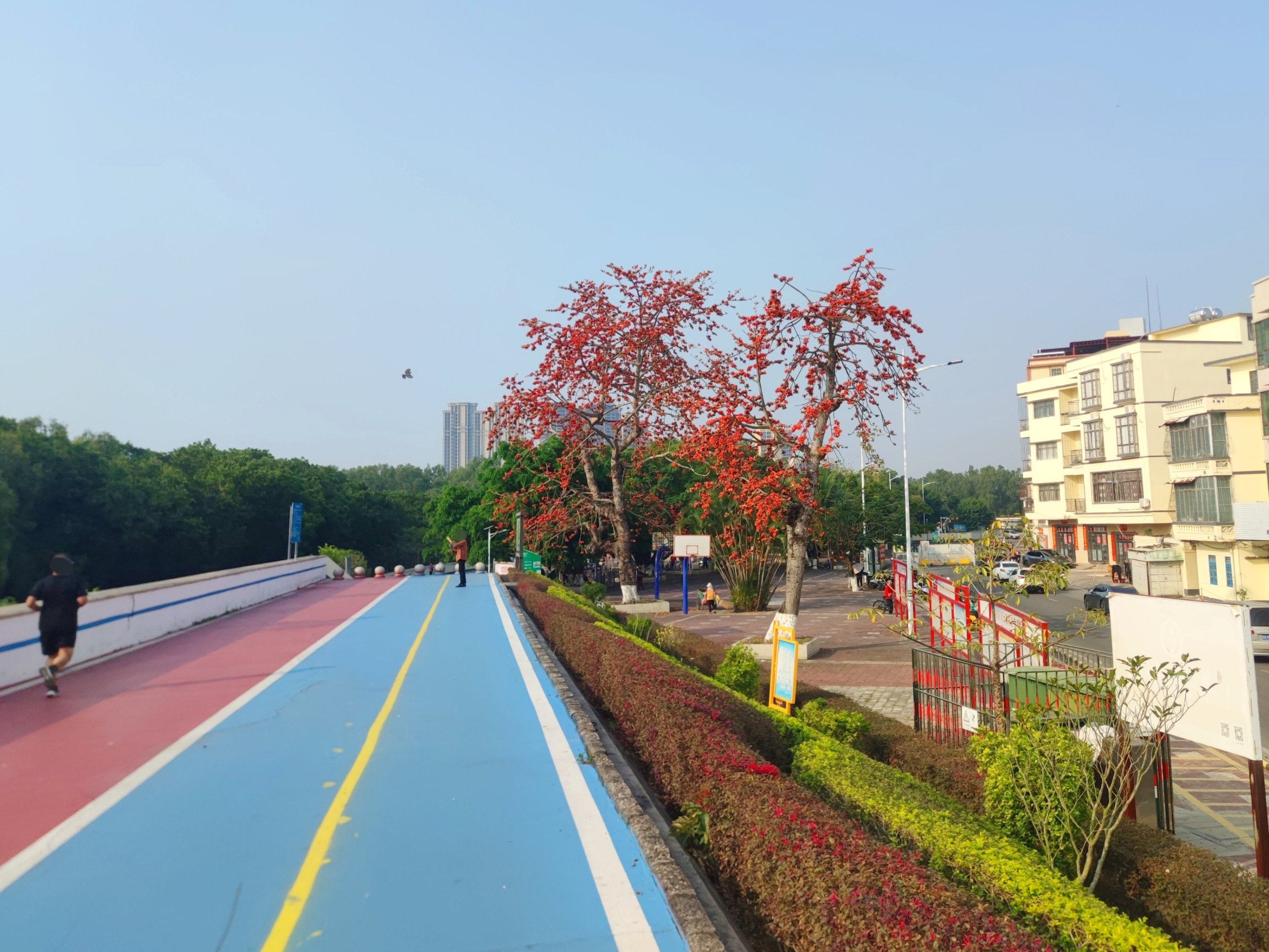 虽然或许只有两棵木棉古树,不过花开时节远处近近的视觉感观还是勉强勉为可以,还伴有鸟语声车来车往等等各种声音~,还有另外好些地方也有零零星星的木棉花开,