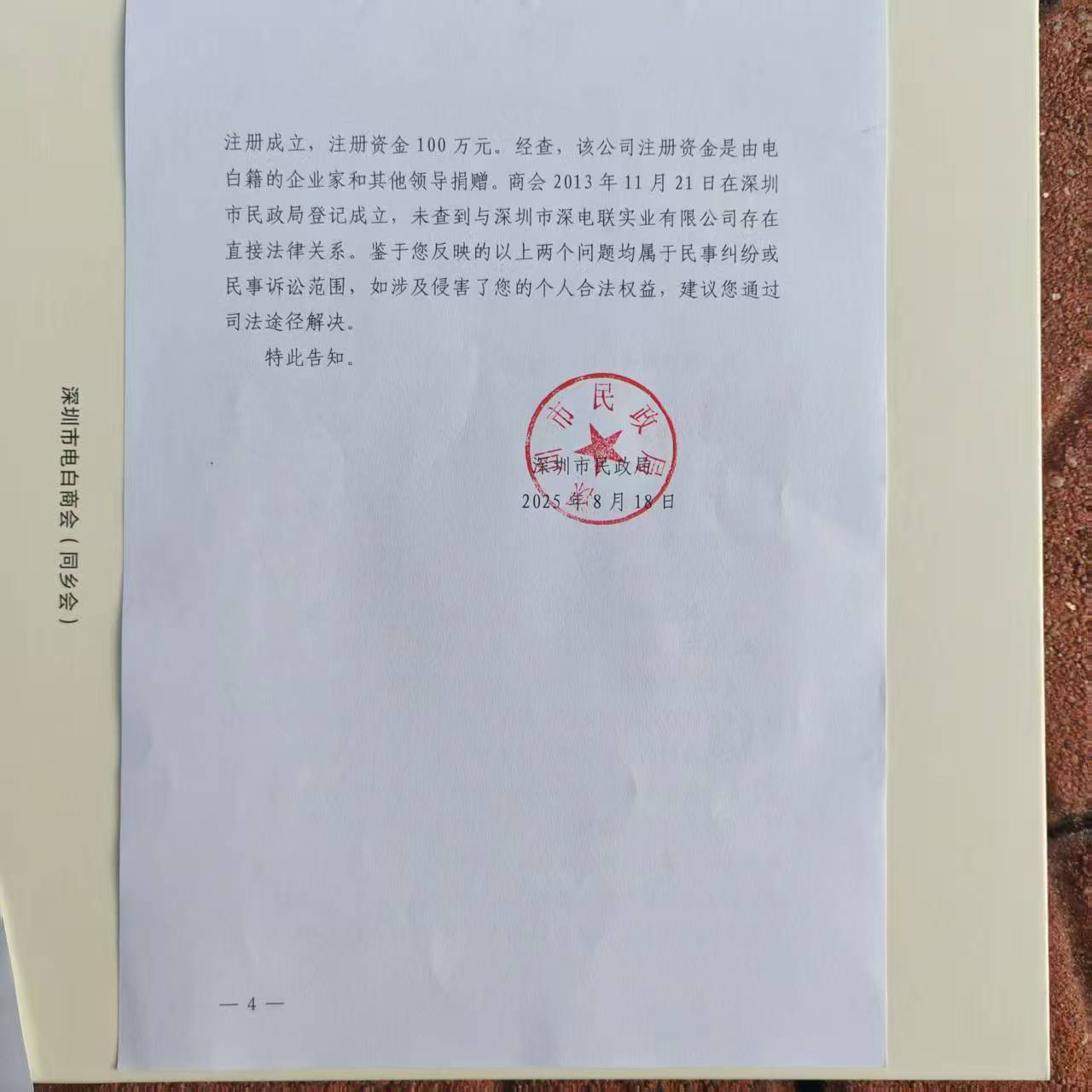4. 历史时序确凿:深电联公司(资产载体)成立于 2003 年,服务于 2001 年成立的同乡会。而深圳市电白商会直至 2013 年才成立。商会与公司资产并无历史渊源和法律上的继承关系。因此,我们维权的行动,不是在争夺“他人”的财产,而是在依法收回本属于我们自己的集体资产, 是在纠正被少数人扭曲的法律表象,回归历史与法律的真相。