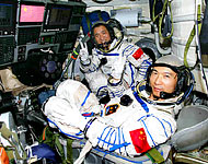 10月12日上午9时整,神舟六号载人飞船在酒泉卫星发射中心点火发射。10月17日4时33分,飞船返回舱着陆。航天员聂海胜和费俊龙在太空飞行115小时32分钟,飞行77圈,行程约325万公里。