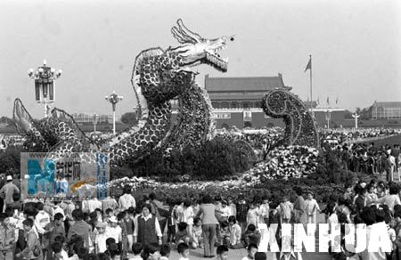 1990年9月22日,北京天安门广场上象征吉祥的凤凰造型花坛,