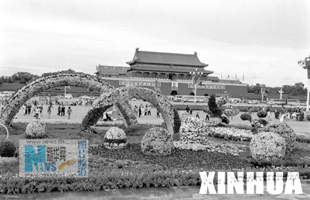 1991年9月30日,国庆节前夕,16万盆鲜花将北京天安门广场装点一新。