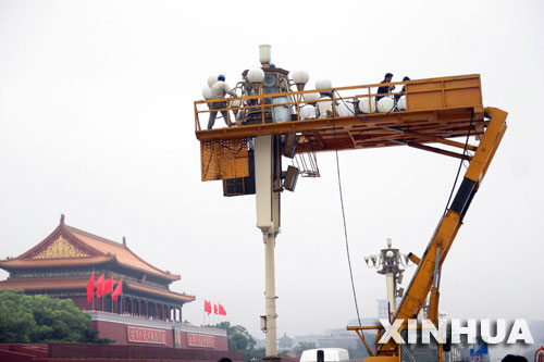 北京天安门广场被装扮得五彩缤纷,鲜艳夺目。
