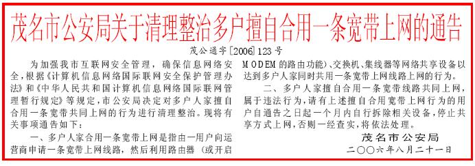 这份编号为茂公通字[2006]123号的通告称:为加强我市互联网安全管理,确保信息网络安全,根据《计算机信息网络国际联网安全保护管理办法》和《中华人民共和国计算机信息网络国际联网管理暂行规定》等规定,市公安局决定对多户人家擅自合用一条宽带共同上网的行为进行清理整治。现将有关事项通告如下: