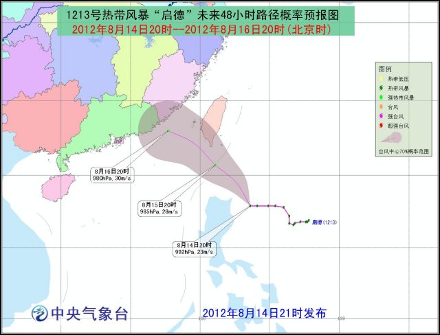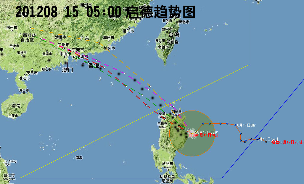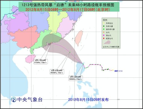 (screen.width*0.8-70)) this.width=(screen.width*0.8-70)'>中央气象台16日06时发布台风橙色预警: 今年第13号强热带风暴“启德”于16日05时在南海北部海面加强为台风,05时其中心位于广东省湛江市东偏南方870公里的海面上,就是北纬18.7度,东经118.2度,中心附近最大风力有12级(33米/秒),中心最低气压为975百帕。 预计,“启德”将以每小时20-25公里的速度向西偏北方向移动,逐渐向广东珠海到徐闻一带沿海靠近,强度继续加强,并将于17日早晨到中午在这一带沿海登陆。 大家做好预防措施!