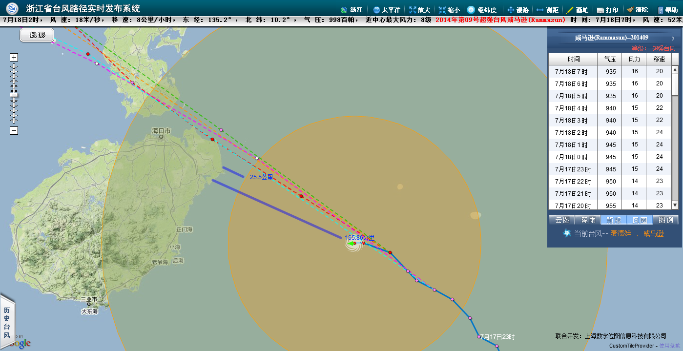 18日早晨,“威马逊”已加强为超强台风级,预计“威马逊”将以超强台风强度于18日下午到夜间在广东电白到海南琼海之间沿海地区登陆,较大可能擦过海南文昌沿海在雷州半岛登陆,对我省影响非常大,粤西海面风力将逐渐加大到13级到15级阵风16级,并有大暴雨到特大暴雨。我省气象灾害(台风)I级应急响应继续生效,请迅速做好防御。防御工作绝不能仅仅限于登陆点附近,沿海尤其粤西沿海市县要迅速防御。