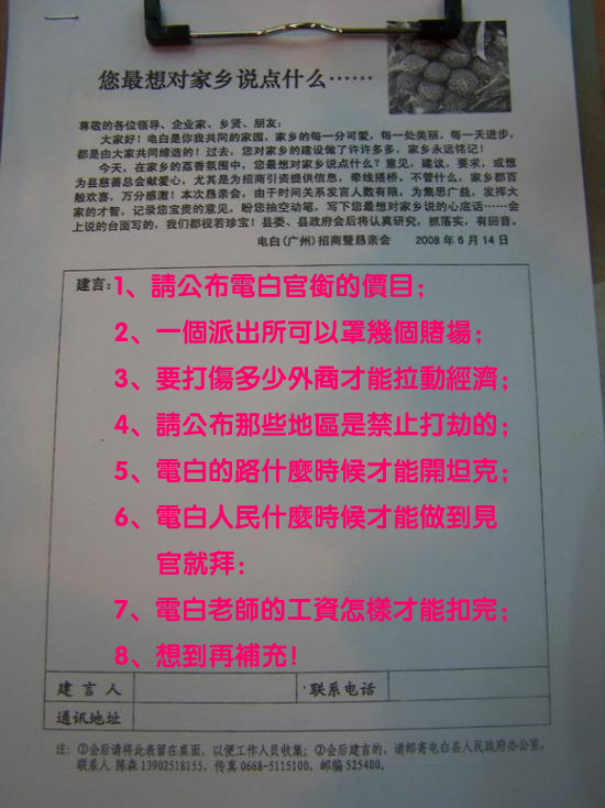 这并不是个人的建议,而是代表着全电白人民的建议,官再大也大不过人民群众吧!