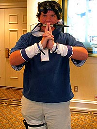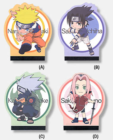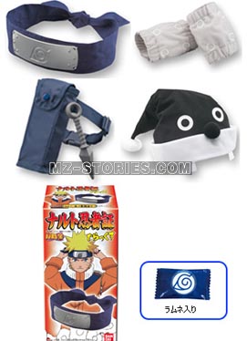 2005年BANDAI出品,精美纸盒包装,内附糖果一枚,全4种,包括木叶护额、苦无包、护肘、 鸣人专用睡帽一款。此次的忍者证又让人耳目一新,新的木叶护额全长有90cm,完全按照人物的头部比例,这次的标志设计采用了pvc,戴在头上不会变形;腿部武器包的设计也按照真人的腿部比例,可调节的绑带设计可以牢固的系在腿部,而且里面还带有一个苦无,物有所值啊;这次的忍者证中又加入了左助的护肘,直径有23cm,同样的可调节设计,让胖瘦不同的你都可以cos哦;这次更让火影fans们惊喜的是漫画中鸣人睡觉时带的可爱睡帽也隆重登场,直径足有55cm