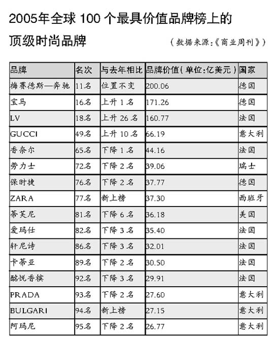 美国《商业周刊》采用INTERBRAND公司的方法,不久前推出了2005年全球100个最具价值的品牌排行榜,16个顶级时尚品牌榜上有名,再次展示了顶级品牌的莫大魅力。