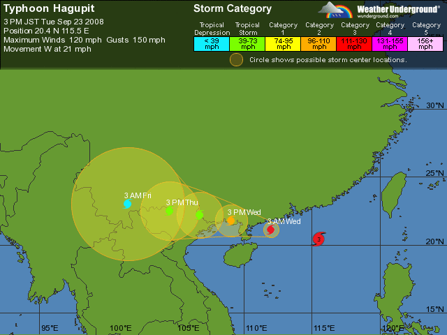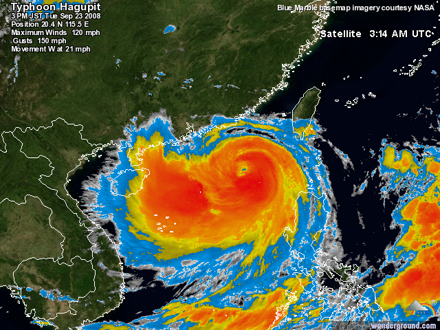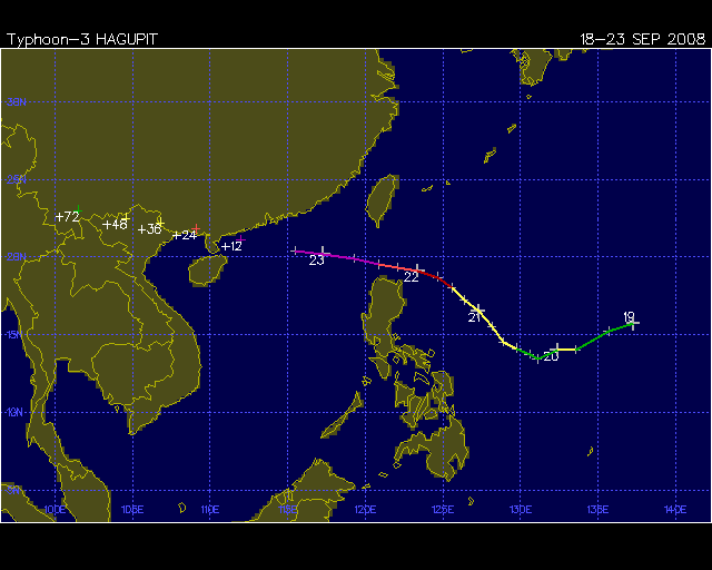 今年第14号强台风“黑格比”(HAGUPIT)昨晚11时前后进入南海东北部海面,今天早晨5时强台风中心位于广东省电白县东偏南方大约760公里的南海东北部海面,就是北纬20.0度,东经118.3度,中心附近最大风力有15级(50米/秒)。