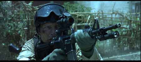 在超级64号战斗至死的两名狙击手中,一个是用加了消声器的M733(扮演加里・戈登),另一个是用M14(扮演兰德尔・舒加特),是电影中唯一的M14步枪。有相关资料提到当年的战斗中美军使用了M21半自动狙击枪,但电影中出现的却是M14步枪。M14步枪是在M1伽兰德基础上改进的自动步枪,但在越南丛林中表现不佳,最终被M16A1所取代。但M14的射程远,精度高,到现在还是特种部队(如海豹、三角洲等)所采用的远距离精确射击支援武器。可能因为都是近距离的交火,所以电影中没有出现狙击步枪。