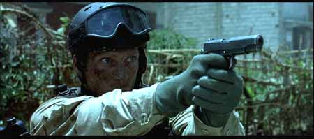电影中三角洲队员的手枪是M1911A1,表现M1911射击的场面就比M9要深刻得多。主要是电影中的三角洲队员们用手枪也用得太历害了。虽然美军早已用M9取代M1911,但美国人对这把.45口径的手枪仍然情有独钟,M1911仍然是一些执法人员或军人的自卫首选。