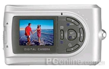 315万像素/无光学变焦/4倍数码变焦/全自动/1.5英寸,TFT彩色液晶显示屏/CMOS传感器/1/7-1/2000秒/内置闪光灯,模式:自动,不闪光,闪光范围:0.9-1.8m/支持不间断无声短片拍摄功能, AVI, 24fps/MMC卡,SD卡,内置14M内存/USB 1.1接口,AV接口/AAA电池×2/82克/89.5×56×24mm